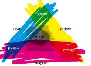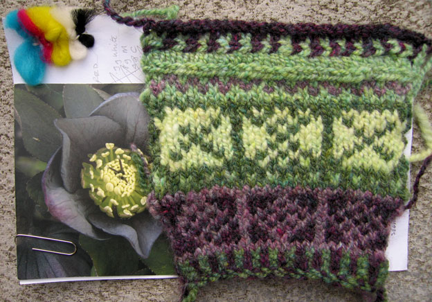 The colours in the knitted swatch were chosen from the card (from Sundara’s sock club a couple of years ago) and made by blending the colours of wool fastened to the paper at top left. No custom dyeing. To do this you need to have a basic understanding of colour theory as used by artists and printers and anyone else working with solid media such as paper: mix yellow and blue together to make green, white and blue make pale blue, black added to anything dulls it and makes it darker, and so forth. If all of this is news to you, websites here and here have some basic explanations (the second one includes black). Buy some coloured pencils or crayons and learn from play! As a reminder, here are the names and basic rules. Colours are Cyan (a clear bright blue), Magenta (clear bright pink/red), Yellow, and Black. The colour system based on these is known as CMYK, with black being ‘K’ for ‘key’, because the plate used to print black also contained the key lines needed to align items and other key information.