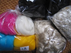 into yarn and knit that yarn into a multi-coloured bag. The rest of the bags are there because I’m feeling… inventive. Dangerously inventive. The amorphous black blob at top are bags of black merino and black tussah silk. On far right is a bag of silk noil, and below that, beside the coloured wool is a bag of undyed filament and tussah silk. How will this become yarn and what yarn will it become? Gentle reader, read on…