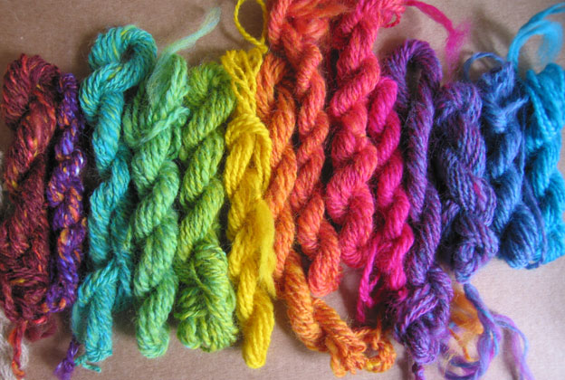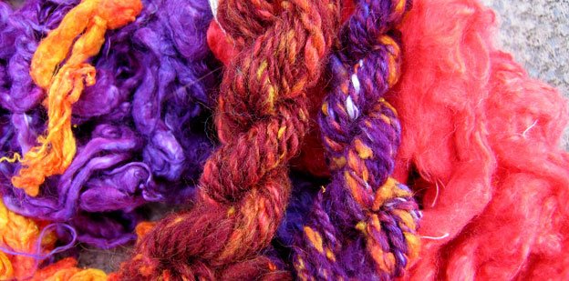 Ignoring the two tiny skeins at far left, here’s an array of colours made from C, M, and that ever-so-slightly orange yellow. That’s what that bag will make (plus white), and it’s still pretty. But what I have in mind will need the true Y, and fortunately I have some in the stash, if not in the photo. The blacks will be needed to make dark greens and browns. The tussah and filament silks will add a sheen to some blends and I might just try using silk content to define shapes. I might dye some of the tussah. I will certainly dye the noil: it can be used to add texture and colour interest to any blend. Here are those two skeins embiggened