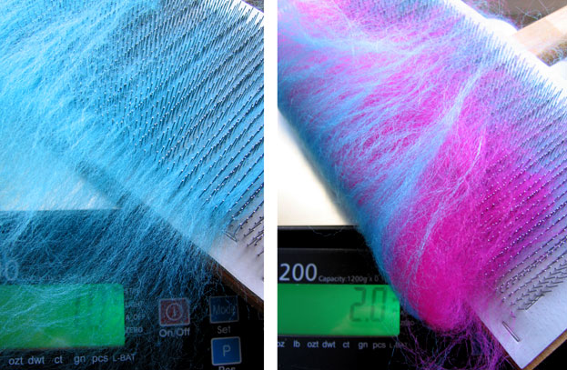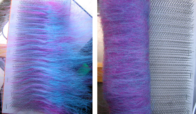 On the left is the fibre after a couple of passes. It’s clear there are two colours on the card (most of the M is still in a layer under the C); if you squint at it, it’s blue with pinkish streaks. On the left is the finished rolag. Look closely and you can see the individual C & M fibres but squint at it, or view it from a distance and… it’s purple. If I’d wanted a darker purple, I’d have added black. Lilac/lavender, I’d add white.