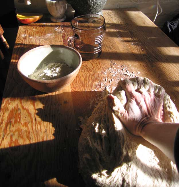When you’ve gone as far as is comfortable, curl your fingers down to catch the ridge of dough in front of your hand and pull that back as you bring your hand/arm back. Use the dough scraper in your other hand to bring stray bits back into the lump, then push away again. Try to build a circular move that rotates the lump of dough as you knead to bring every bit of it into the kneading process. It feels awkward to start with, but persevere: it’s much kinder to your joints and is particularly good for handling sticky, wet doughs. When the gluten is reasonably well-developed I use the two-hand method to form a nice tidy ball to be put well-buttered bowl, covered with a towel and left to rise until doubled in bulk. This increase in volume is the key to a nice light bread, as opposed to the brick-like objects I insisted were bread when I first started baking. I mean, they were flour and salt and yeast… had to be edible, right? :-)