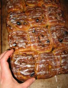 While the buns are in the pan it’s hard to check that the toffee base has worked so what I do is: remove the buns from the oven when the tops look done. Leave sit for about a minute, no more than three, to allow the toffee to set a little bit, then run a knife around the edge of the pan and turn the buns out as a slab, scrape any toffee left behind off the pan and apply to naked bun-bottoms. If you haven’t used teflon paper and you wait too long, the toffee will stick the buns to the pan; if that happens, carefully and evenly heat the bottom of the pan over a low burner to melt the toffee a bit, then turn out. Best to avoid this if you can. If, when you’ve turned the buns out, the toffee isn’t quite toffee enough, you can put the entire slab under the grill for a couple of minutes to properly melt the sugar and butter. Watch like a hawk to ensure nothing burns.