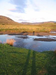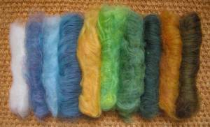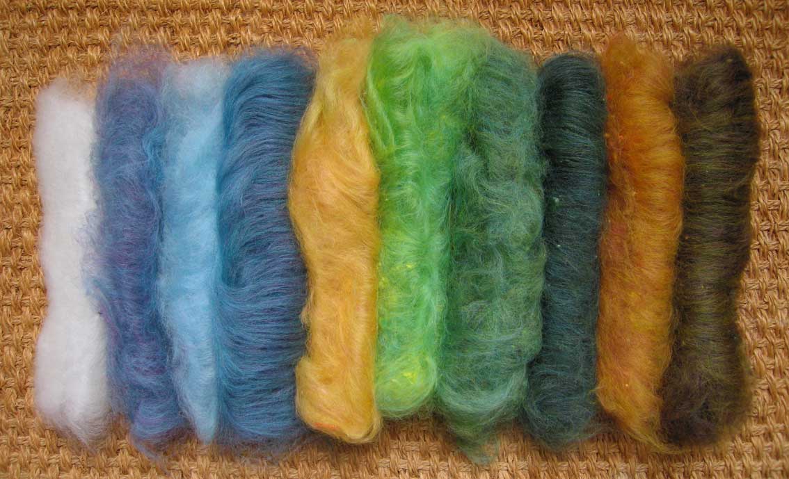 I chose colours from that photo and tried to match them or at least come close, by blending dyed wool on handcards (see this post for more details). I added white and black silk to some blends, and others have silk noil in shades of green and orange to reflect some of the variation in the colours of the photo. The final list is Dawn Sky, River/Cloud Purple, Grass Gold, Beach Bronze, Islet Brown, Bright Grass Green, Mid Grass Green, Dark Grass Green, Shadow Blue, and Cloud White. The fibre for each was weighed as I created it, so I can blend more to match. Which is just as well.