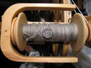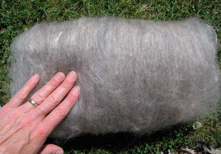 directly onto the drum, then covered it with more Romney. 60g of Romney and 9g of silk later, I removed the batt and fed it through again. I’d have done a third (I tried lashing some silk across the drum, but these strands didn’t blend on that pass, the action just brought them together in a solid strip), but the silk was starting to think about nepps. The end result: