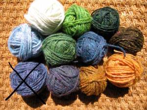 The p-chullo pattern requires 10 colours, and there are 10 in that shot, but after looking at them laid out I realised that the beach bronze (second from right) was too bright, and the shadow blue (fourth from left) was too similar to the river/cloud. So I added some black to the bronze, and lots of black and more magenta to another attempt at the blue. The pattern is written for Berocco Ultra Alpaca, a 3-ply, so I blended 3 batts of each colour. I happen to have some, so I unraveled a length, made a sample card and started spinning.’X’ marks the wrong blue; I have to say its replacement, next to it, is one of the prettiest colours I’ve seen anywhere. This is how to get colours of the beauty and subtlety of the Starmore collections. Also I am very, very proud of the quality of some of that handspun!