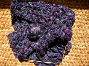 Another Aeolian in BMFA Rook-y, like the first. Hand-dyed yarn varies: this isn’t as pretty as the first, the colours are brighter, but I can fix that with a bath in 10 or 20% black dye before I block it.