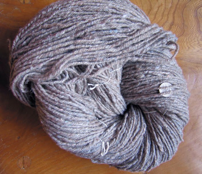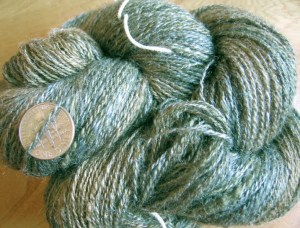 Exemplar the First. That was two large rolls of ‘Montana Agate’ roving, a blend by Three Bags Full from The Bellwether, bought in my first flush of enthusiasm three years ago. Lovely stuff, a subtle blend of silks and wools. Huge, lofty bags, they were… but when I found them in my Bin of Treasures, they’d been squashed beyond recognition. Fortunately the wool bounced back a bit, lofting as I ripped chunks off, but it never regained enough air to become a pleasure to spin. I’ve become so accustomed to drafting with ease that this took me by surprise; I knew some was over-twisted, but I hadn’t realised how badly until I plied it. The singles were twining around themselves even before they hit my left hand, and it’s the constant forcing back through the incipient tangles to get another arm’s-length on its way to my right hand and the orifice that cut into my fingers. It’s become 345m of 3-ply. Lots of hats and mittens, perhaps.