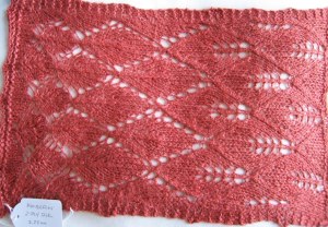I’ve designed a small lace swatch for the Rampton Project in 2010. I’ve knitted it in handspun red silk, light fingering weight