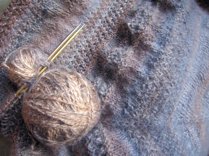 That’s my ‘New England’ Luxury Spinners’ Set from Spindlefrog spun as a heavy laceweight 2-ply, becoming a Textured Shawl based on Orlane’s Textured Shawl Recipe (Rav link). I’ve added a texture or two; I keep telling myself the unevenness will magically disappear during blocking. Fingers crossed…