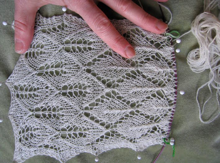 I’m knitting it in laceweight merino, my very first spindle-spun laceweight:
