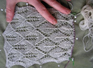It’s a variation of the patterns I used in the ‘Teaching Shawl’, most of which are based on various forms of leaf lace. I’m minded to put a lifeline through the current version when I reach the end of the chart, then strike out for unknown territory and a pattern for a different shawl. If I am pleased with the result and can remember what I did, I will chart it (yay! for KnitVisualizer) and then knit it in that green and gold. I’ve just remembered that those are the colours of the U of A. Ah, memories.