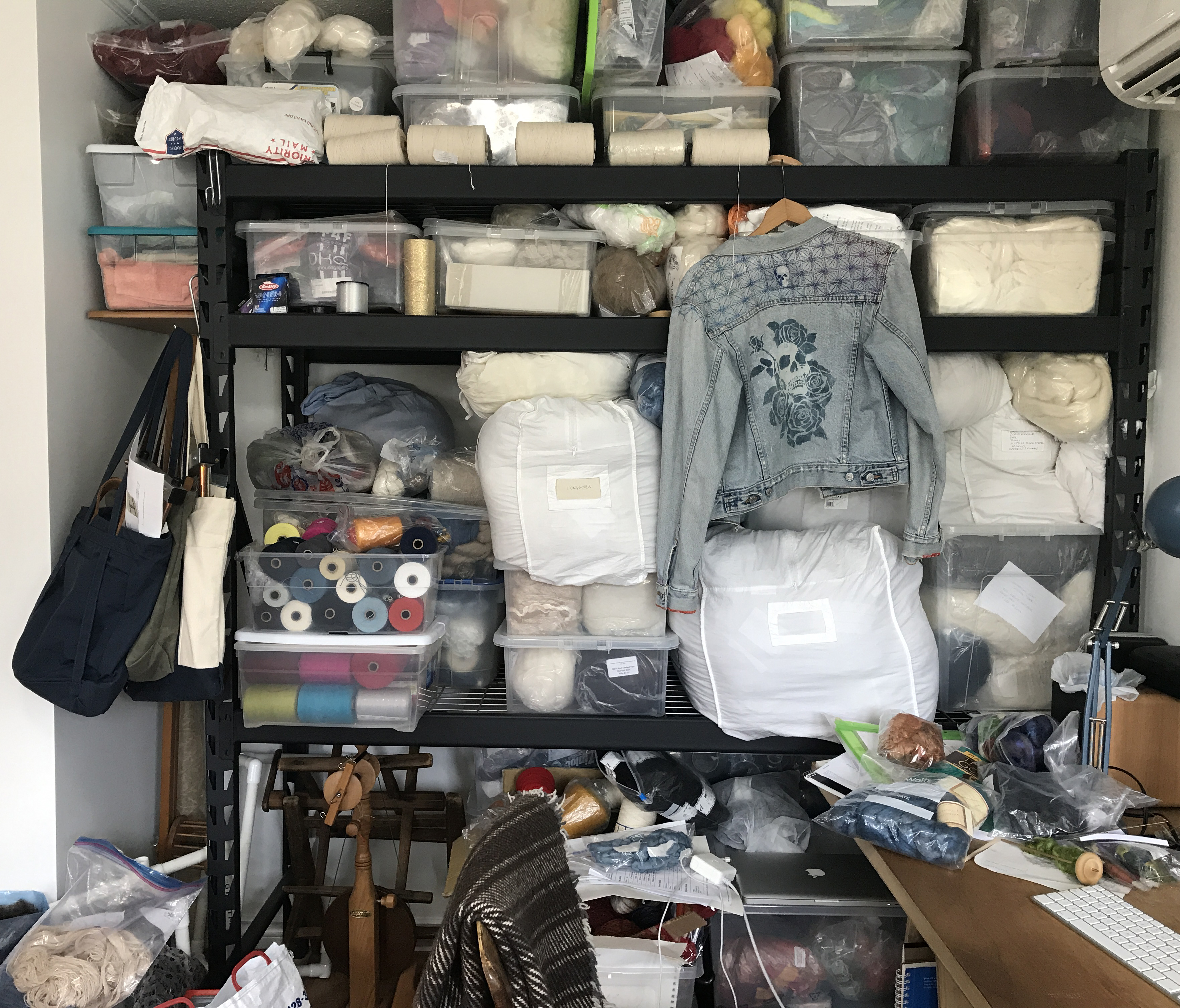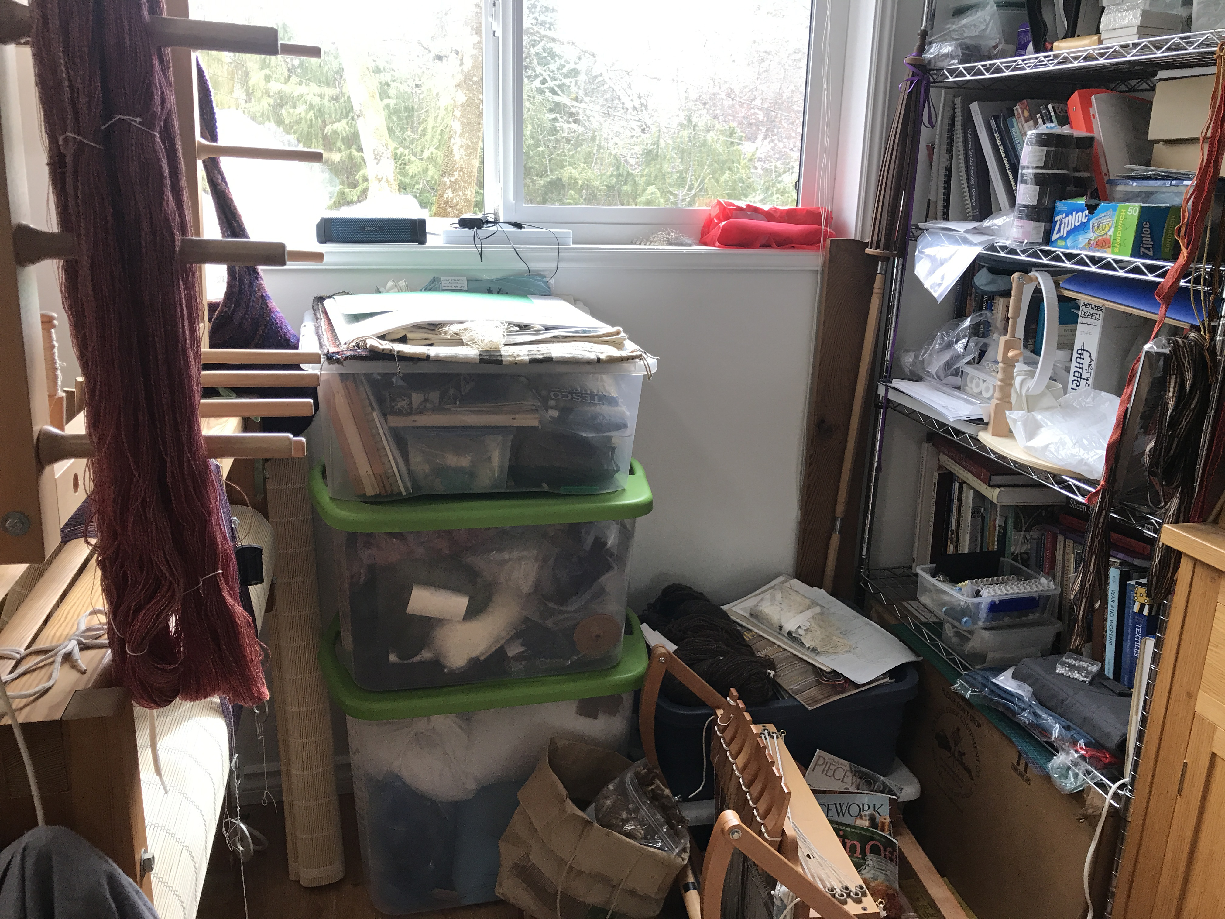 I tried spinning from several clouds of de-seeded fibre, both fresh (so slightly damp), dry (about a month after gathering), and re-wetted with a mister. The re-wetted were easier, probably because the droplets of water help to hold the fibres together: the moisture did not soften the fibres, which remained stiff and inelastic. It spun in the sense that the twist picks up fibres to bring them into the forming yarn, but because of the stiffness and the variation in fibre thickness the yarn is excessively uneven (see the tiny thin tightly twisted yarn on the spindle hook contrasted with far less twist in the thicker area above.