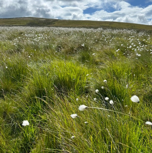 Bog cotton aka cotton grass, Eriophorum angustifolium, is now classed not as a grass but as a sedge. It grows in damp, acidic soils across the Northern hemisphere, flowering from May through June, when a dense patch can look like fresh snow lightly scattered on a green hillside. In the hand it does look a bit like cotton (especially if you’ve never seen raw cotton in your hand) so hand spinners inevitably wonder if it could be spun like cotton: how wonderful to gather it from the hillsides to produce a lovely local yarn.