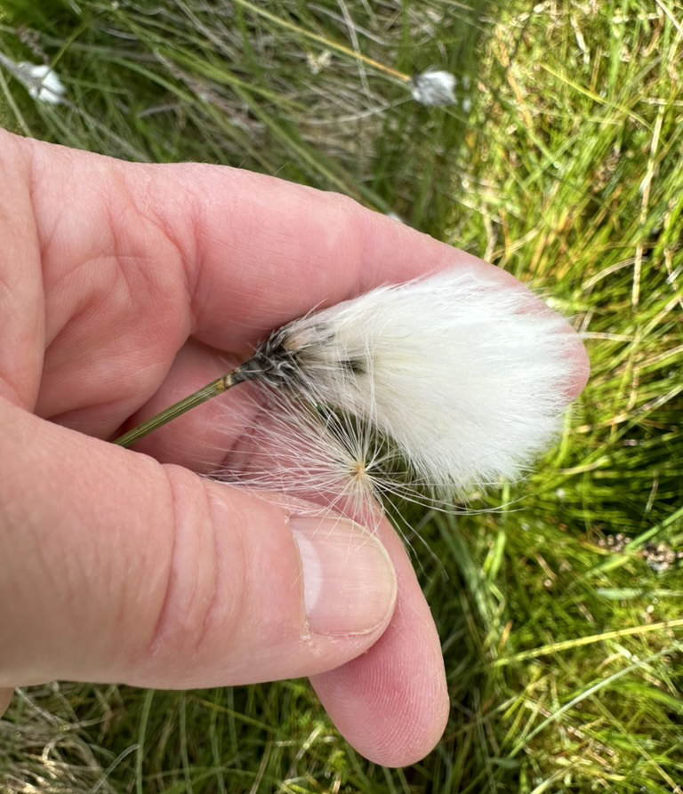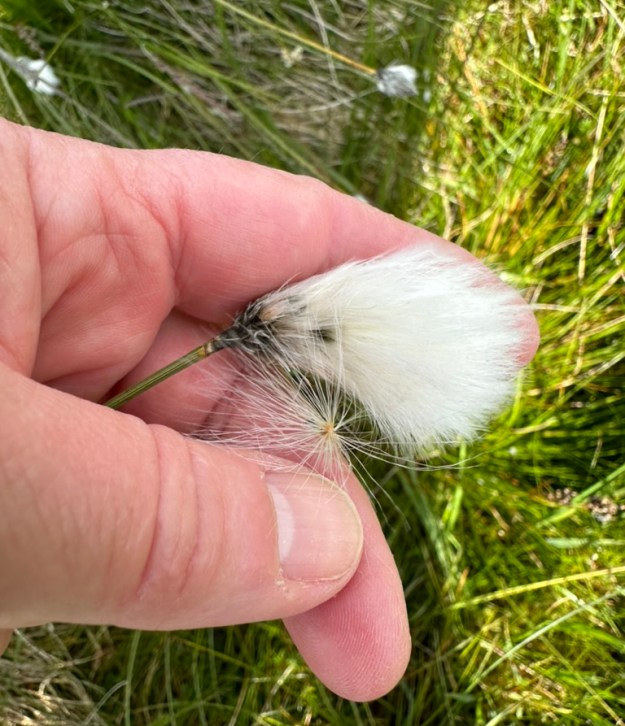 A tuft of cotton grass in my hand. The long, straight fibres are relatively coarse and stiff. The single seed below it shows why they must be stiff: when the seed is ripe the fibres attached to it open up like a dandelion seed parasol to catch the wind.