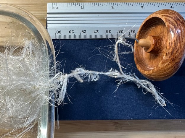 I could not spin a competent [yarn that does not lengthen under tension] singles. Rotating the spindle in my hand while pulling it away from the fibre mass allowed the twist to make a soft singles; adding more twist to prevent the fibres sliding on each other invariably resulted in the singles snapping before it became competent. When I tried to suspend the 10gm spindle on the singles either a slub slid apart (because the fibres are stiff and smooth) or a thinner area snapped (because the fibres are brittle).