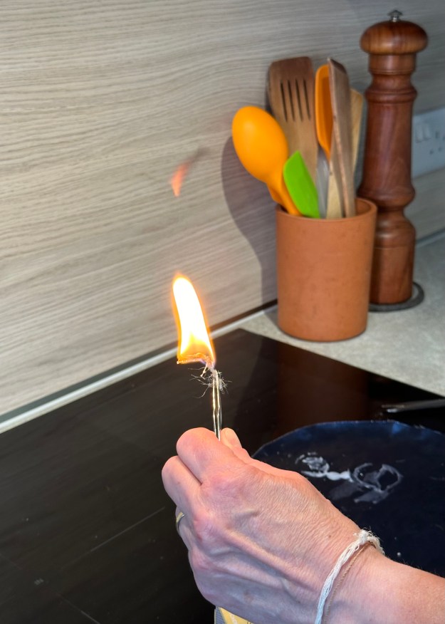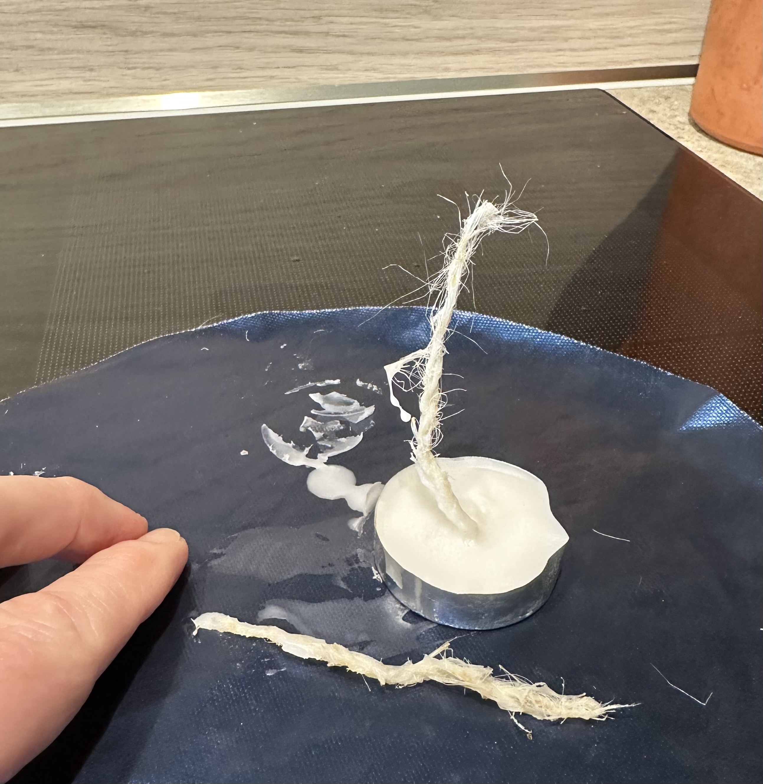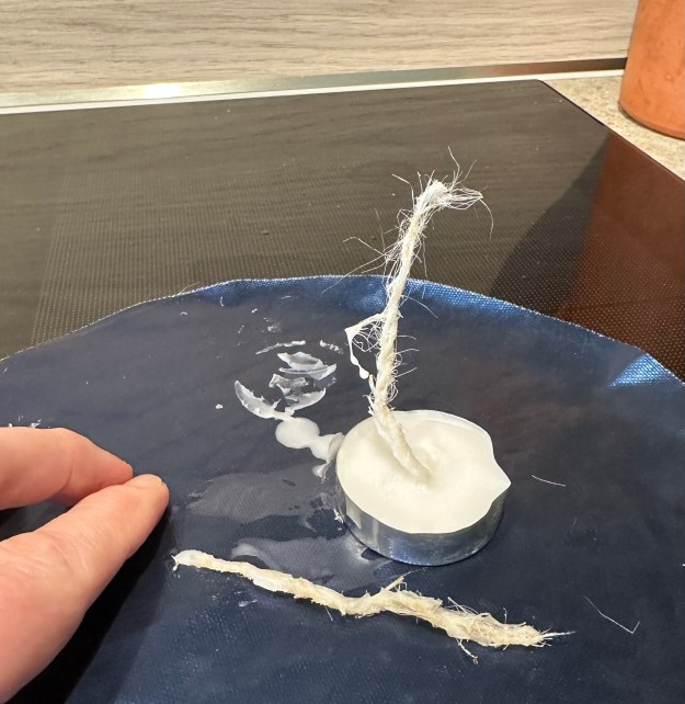 So the fibres hold wax. I trimmed the tea light wick short, asked my husband to take pictures, then struck a match: