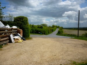 The car is usually parked in this gravel area when I walk to Clopton, but this time it’s nearly 7 miles away! The white objects seem to be junked refrigerators and freezers, possibly left to leak their refrigerants until they can be disposed of without paying for storage and disposal of freons. Grrrr. Cross the road and head down the High Street…