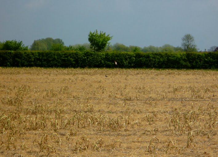 The path is marked by a tractor driven across an entire field of glyphosate autumn. I hate this: it’s spring, this should be green and full of life. But there is some life here; although there’s relatively little food available, sparsely vegetated ground is what some birds prefer for nesting. A lapwing was displaying to my right as I took this picture, so I tested the zoom to its limit…