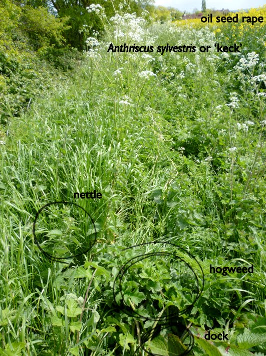 I was wearing shorts. The keck (that’s what my husband, born in Lincolnshire, uses as a generic term for all white umbellifers) is just a nuisance, but nettles sting and the sap of hogweed (Heracleum sphondylium) causes photosensitivity: it disables the skin’s response to sunlight, resulting in sunburn. It’s not nearly as bad as some of its relatives, such as Giant Hogweed and Cow Parsnip, but still… I walked carefully here.