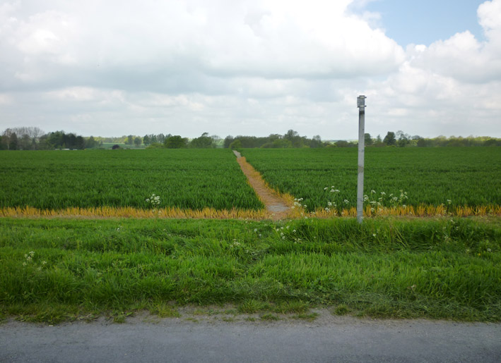 Here the cross-field path leaves the road. The stripes of bright autumnal colour mark places where glyphosate has been used to clear the path (cross-field paths are supposed to be clear ground for walkers), and to kill everything in a ‘sterile strip’ around the field margin. Striving to drive forward from the hips, powered by the glutes, with a mid-foot strike rolling to push off and up from the ball of my foot (instead of hammering my heels into the ground) I stride off, totally distracted by paying attention to my feet. Try it. I dare you.