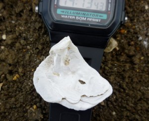 It’s a fragment of shell. A very waterworn fragment of shell, but it’s still got some sand cemented to it with what looks like white mud. In a pea field, full of silt and clay. Next to a stream, admittedly, but the stream is full of silt and clay and besides which, that thick large shell is from a saltwater mollusc. Why is it here? Perhaps it’s in some way related to the Roman villa site about 2 fields over. Or perhaps it’s much, much older, about 95 million years older, eroded out of a lump of chalk. That would explain the white mud. Debating the matter in my head occupied me nicely until the SMS discussion about whether or not he’d meet me at the pub about 15 minutes from home. In the event I opted for a shower first and after that I was too tired to move. Except to eat our well-deserved dinner!