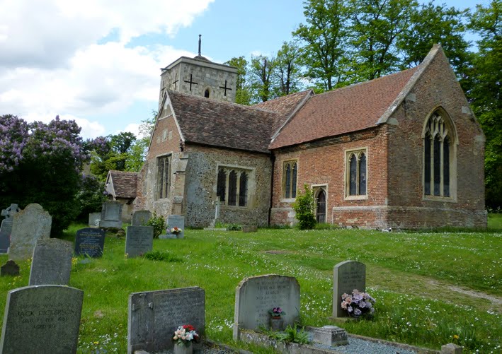 And, down the hill, this is All Saints, Croydon. A classic small church for a small village. The original nave, the main part of the church, is built using a wide variety of stones that would have been found in local fields – not a lot of money here in the 13th and 14th centuries. And perhaps they didn’t choose the best location or the best architect: one of several large brick buttresses is just visible between the entrance porch and the chapel, and those large black crosses on the tower are not windows, they’re the fixings for metal bars that run across the tower to stabilise it. The brick chancel was built in 1684, replacing the ruinous original.