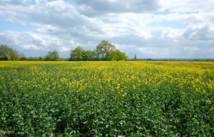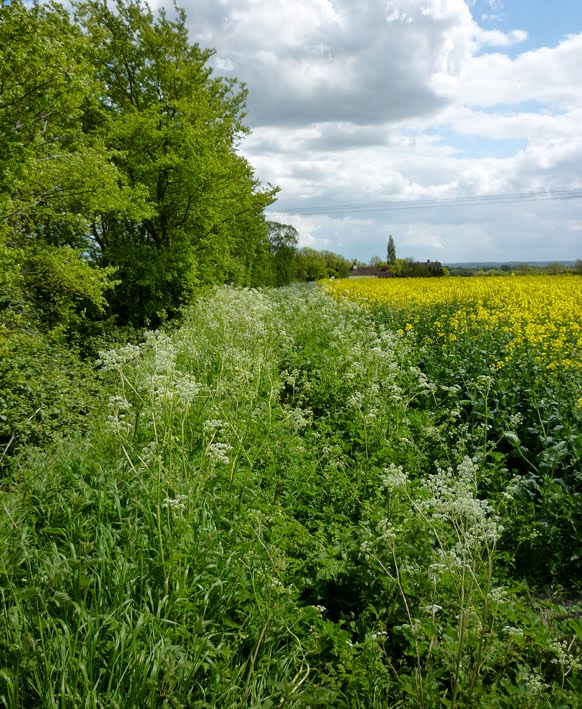 Croydon Lane originally continued straight ahead, across this field of Oil Seed Rape (canola to North Americans) to the line of trees (the footpath did, too, until relatively recently). The second moat would have stood to the right of the line of the Lane.