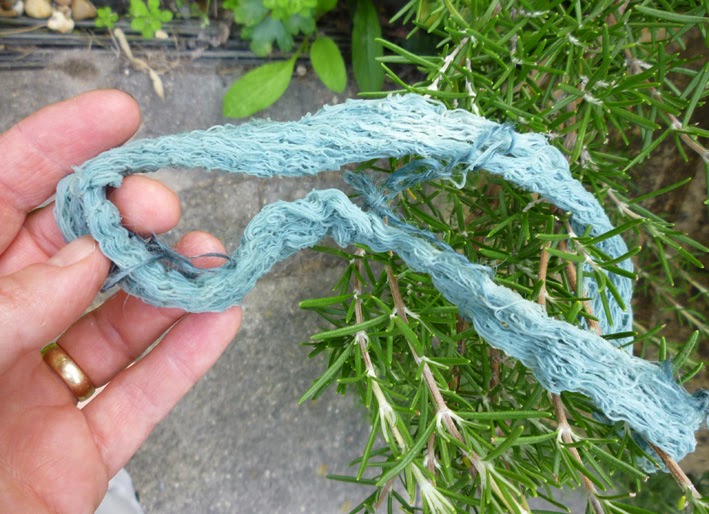 Different fibres take and hold indigo differently: unlike ‘chemical’ dyes, in which the dye molecules chemically bond to the material, the soluble yellow indigo penetrates into microscopic cracks and crevices where, with luck, the insoluble blue particles are trapped, wedged firm. Those that aren’t trapped firmly will come off on your skin (and everything else) as the indigo blue ‘fades’ over time. Silk and other very smooth fibres have fewer places to trap indigo, so tend to end up paler than wool or cotton. But when they first come out of the vat, everything is simply glorious blue. In this case, glorious blue FROM LEAVES!!!