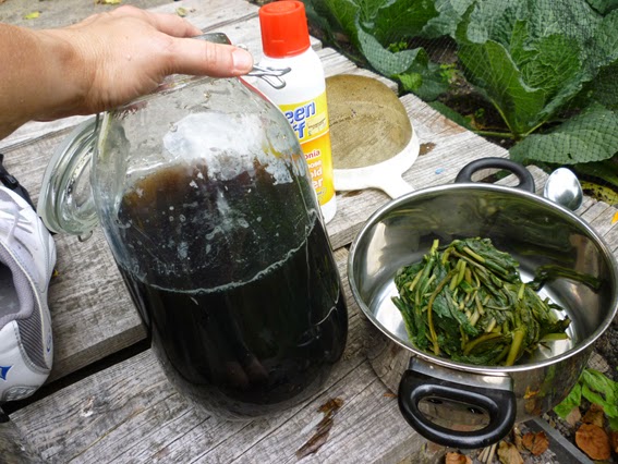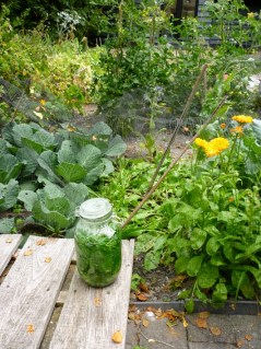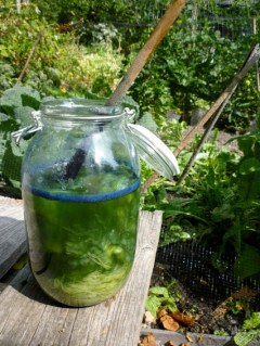 Pick the leaves as quickly as possible, and stuff them into a container. A large glass jar is good because you can see the fluid change colour, which is helpful. No need to shred them finely or anything, I just grabbed handfuls, slugs and all, ripped them in half and stuffed them into that large jar.