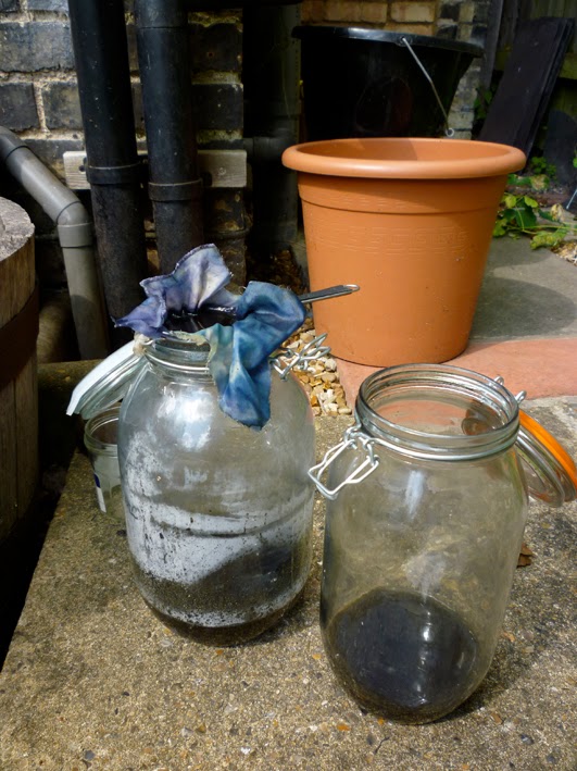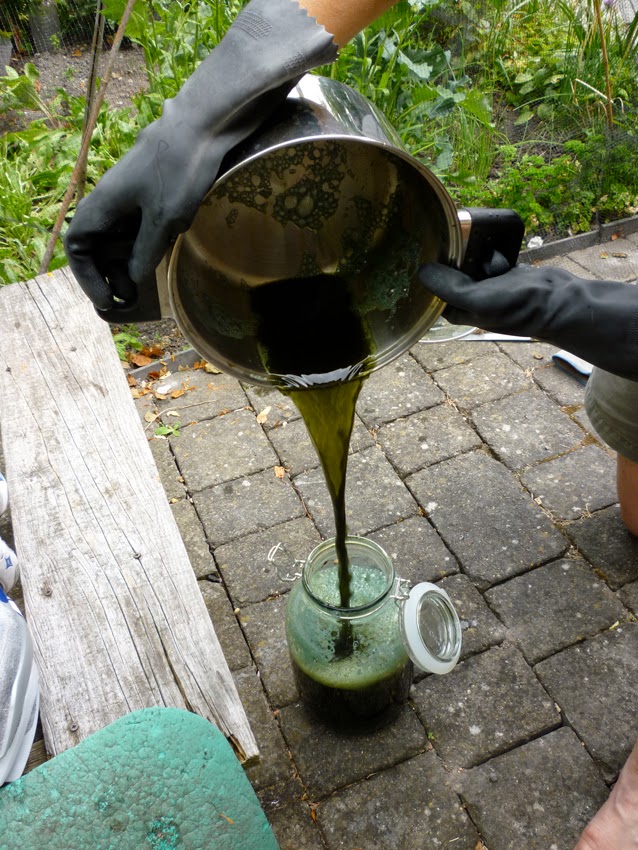 First grow your woad. I suspect it’s important to move as quickly as possible from harvest to hot water, so I set up my kit next to the woad, which is the lowish, bright green, elongated leaves to the right of the cabbages. The net is essential: everything under the net is extremely dangerous is food for the caterpillars of Cabbage White butterflies. If you don’t prevent the adults from laying eggs on the leaves, you will have no leaves. Ignore our bike gear, it’s just drying out/absorbing UV to kill bacteria.