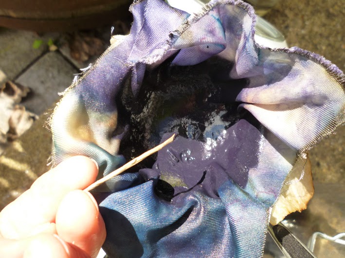 I scraped the couched woad into the hot water, stirred it thoroughly for 5 minutes, then dumped it into the vat solution to cool it rapidly.