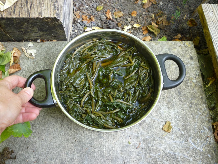 About 12 months ago I ordered both Japanese Indigo and Woad seeds, my cunning plan being to throw cabbages to the wind and grow blue instead. Alas, I have no greenhouse: the bitterly cold winter and late, wet spring put paid to the Japanese Indigo, which even indoors scarcely showed a leaf before giving up the ghost. This isn’t the climate it was looking for. Woad, on the other hand, was and still is grown here as a crop, so I expected more of it. To its credit, it delivered. Woad is apparently a gross feeder, in this case meaning that it needs nutrients and lots of them, rather than having no table manners. I fed it regularly with blood, fish and bone, and watered regularly in dry weather. It’s biennial; the first year leaves give colour, the second year there is no colour (can’t vouch for this yet), but you get seeds to grow more. Harvest the leaves from midsummer on. This post depicts events on July 21, my first pick.