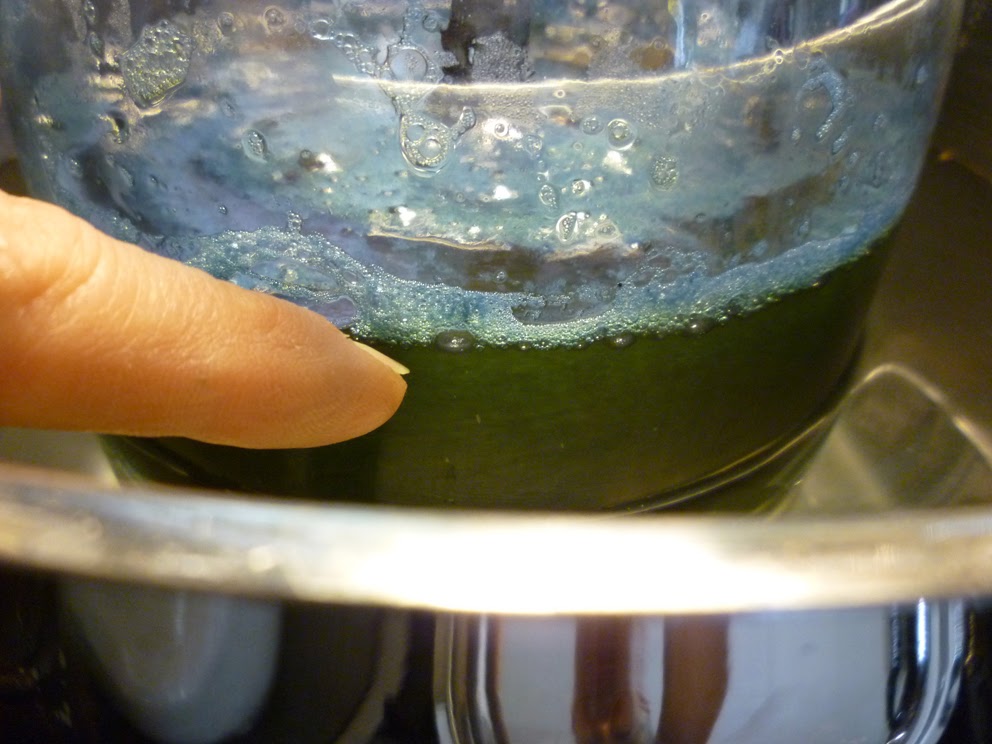 The chemistry of indigo dyeing is not complicated, but it’s important. The dark brown fluid in the jar contains indigo from the woad leaves in the form of indoxyl (more detailed info on Wikepedia, scroll down to Extraction). To extract the indigo from the fluid, add a glug (about 1 tablespoon for this jar) of household ammonia to the fluid. Buchanan says baking soda will also work, I haven’t tried it.). Now pour the fluid back and forth between two containers, exposing it to the air as much as possible. You want bubbles and lots of them!