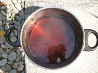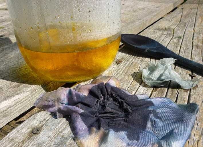 When it looks like that it’s ready to use. Take the jar off the heat if it’s more convenient. Squeeze excess water from whatever it is you’re dyeing and add it to the jar.
