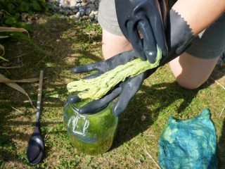 Basic equipment for an afternoon of fun: well-wetted materials to be dyed blue, plus a large container (I used a jar because I can see the colour of the liquid in it), a large wooden spoon, rubber gloves, a glug or two of household ammonia, a BIG saucepan or stockpot (it will hold only water), with trivet and a thermometer accurate from 0–100°C. For further excitement you’ll need a saucepan you don’t use for food, and 1 tsp of alum mordant. Read the instructions below to make sure you understand what you’ll be doing and why.