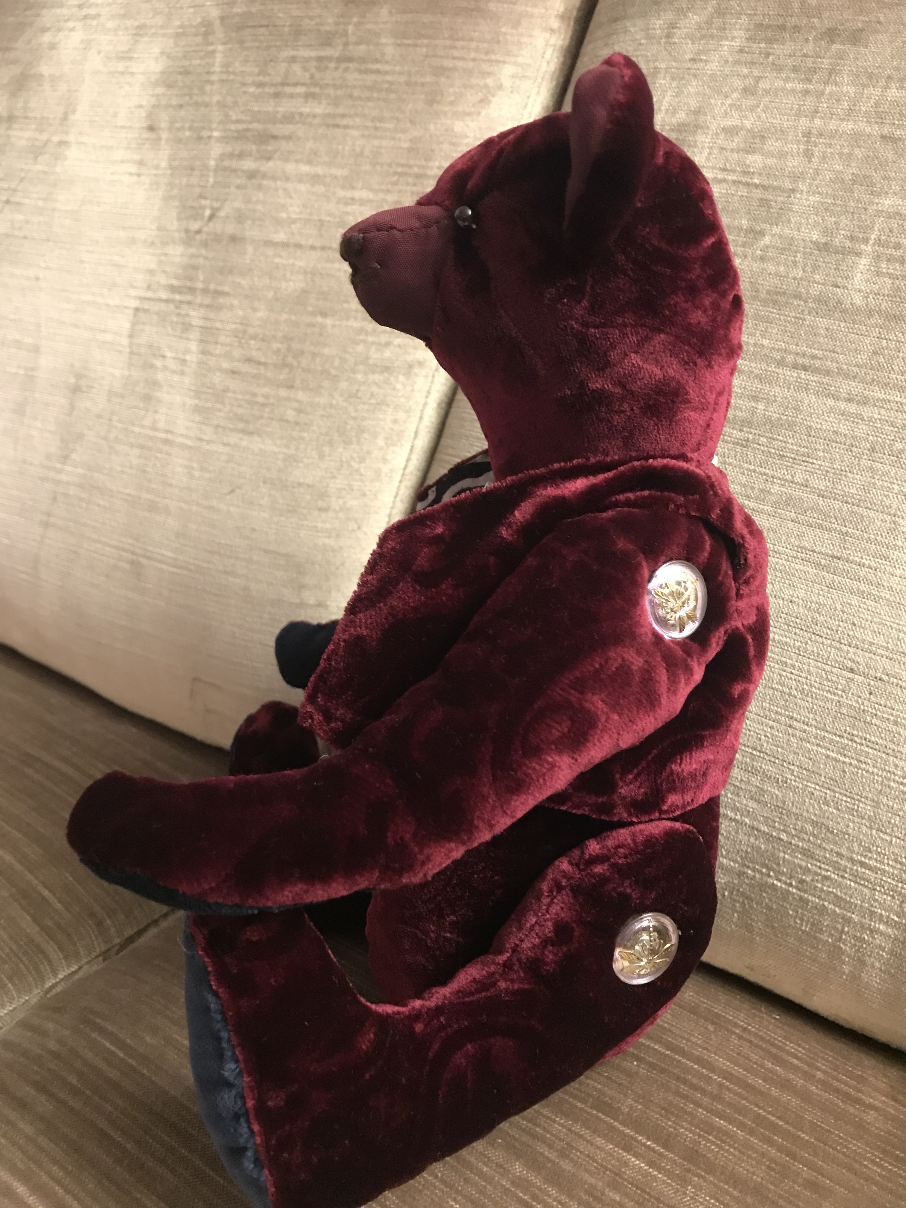 I had thought the burgundy velvet would become a stage bear, glittering larger than life in the spotlight. I drew a new pattern to make his head larger, his body heavier, a little less mild-mannered ‘teddy bear’ and a little more ‘bearish’. By the time I’d finished the head I knew this would be no glittering stage character. I thought he might become a Regency toff, but no. By the time I’d sewn all the parts he’d become a 1960s hip bear, a bear in with the In Crowd. I gave him a silk and lace cravat sewn on with a stickpin to prevent amorous ladies appropriating it as a souvenir, and designed a waistcoat lined with — I have today discovered — a genuine 1960s designer silk.