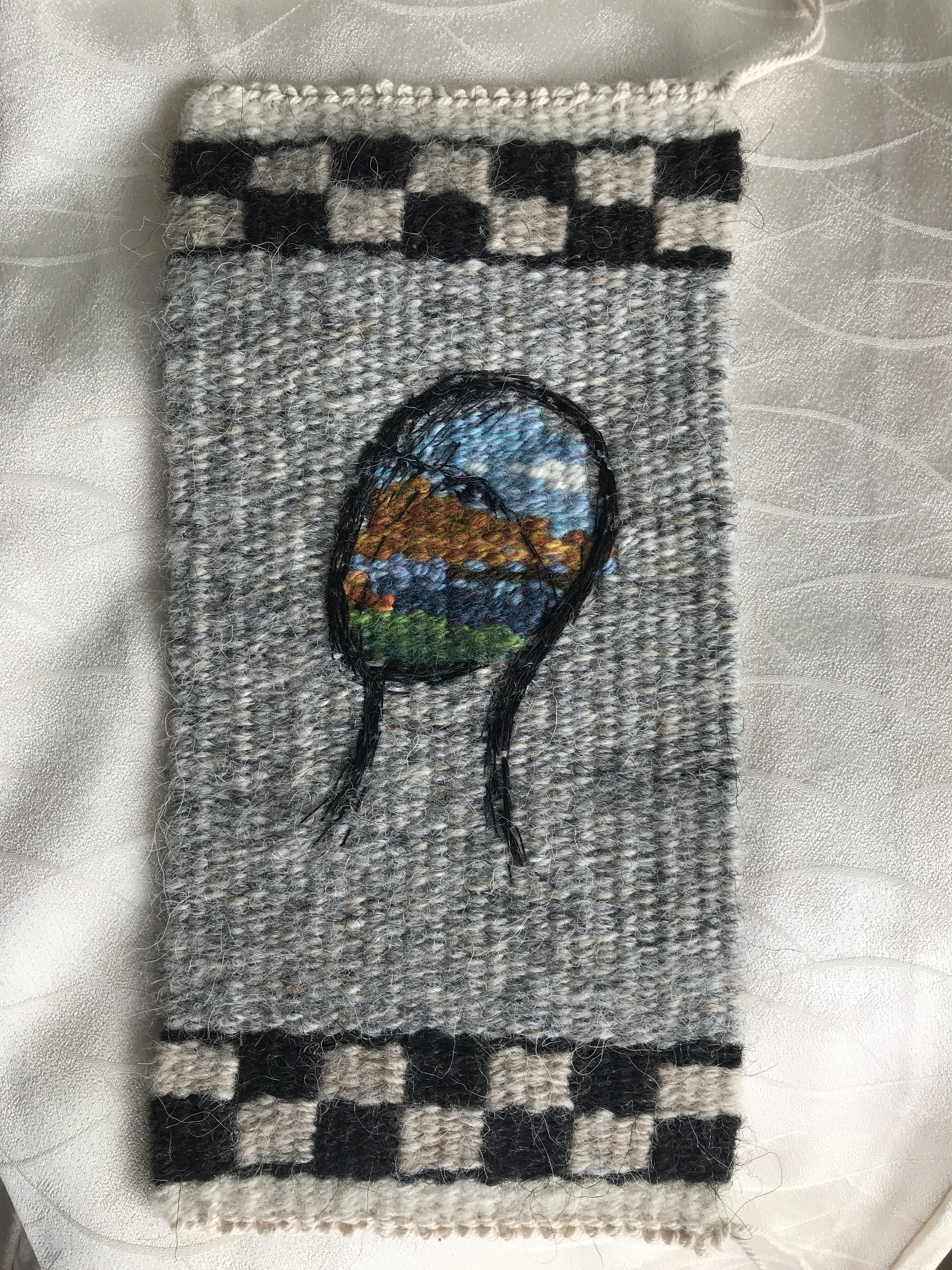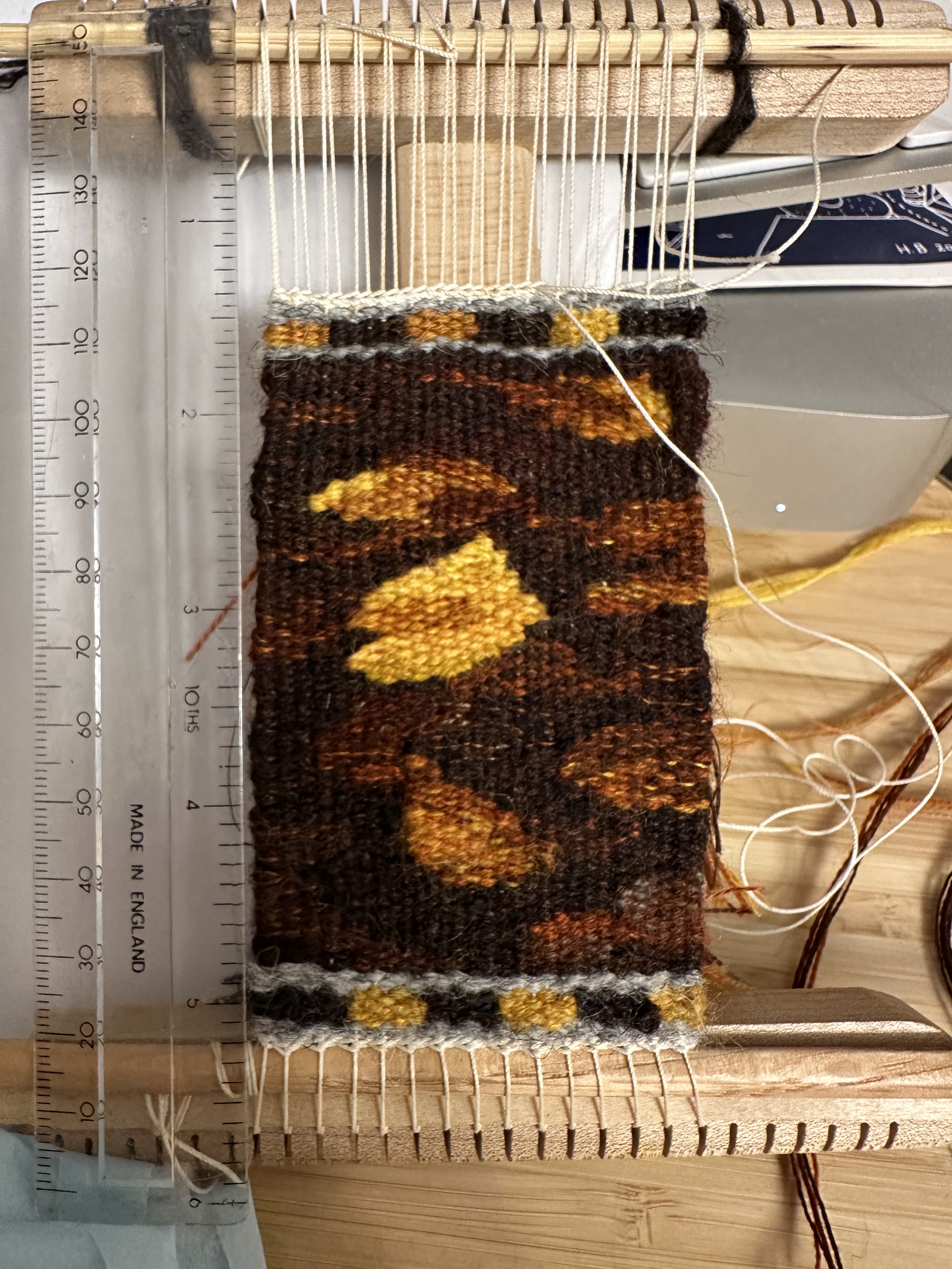 I have no memory of looking at a tapestry or a picture of a tapestry and thinking ‘I could do that’. Maybe Sara Lamb’s book Woven Treasures planted a seed. In 2015 I remember asking A to cut the centre out of a small piece of plywood to make a tiny (insanely tiny, really) portable loom, which I warped with scrap tatting cotton to needleweave a tiny 1″ square using scrap lengths of handspun silk on a flight somewhere. I don’t have a picture of it, but I remember finding throwing away that fragment and host of other small memories when packing to return to the UK.