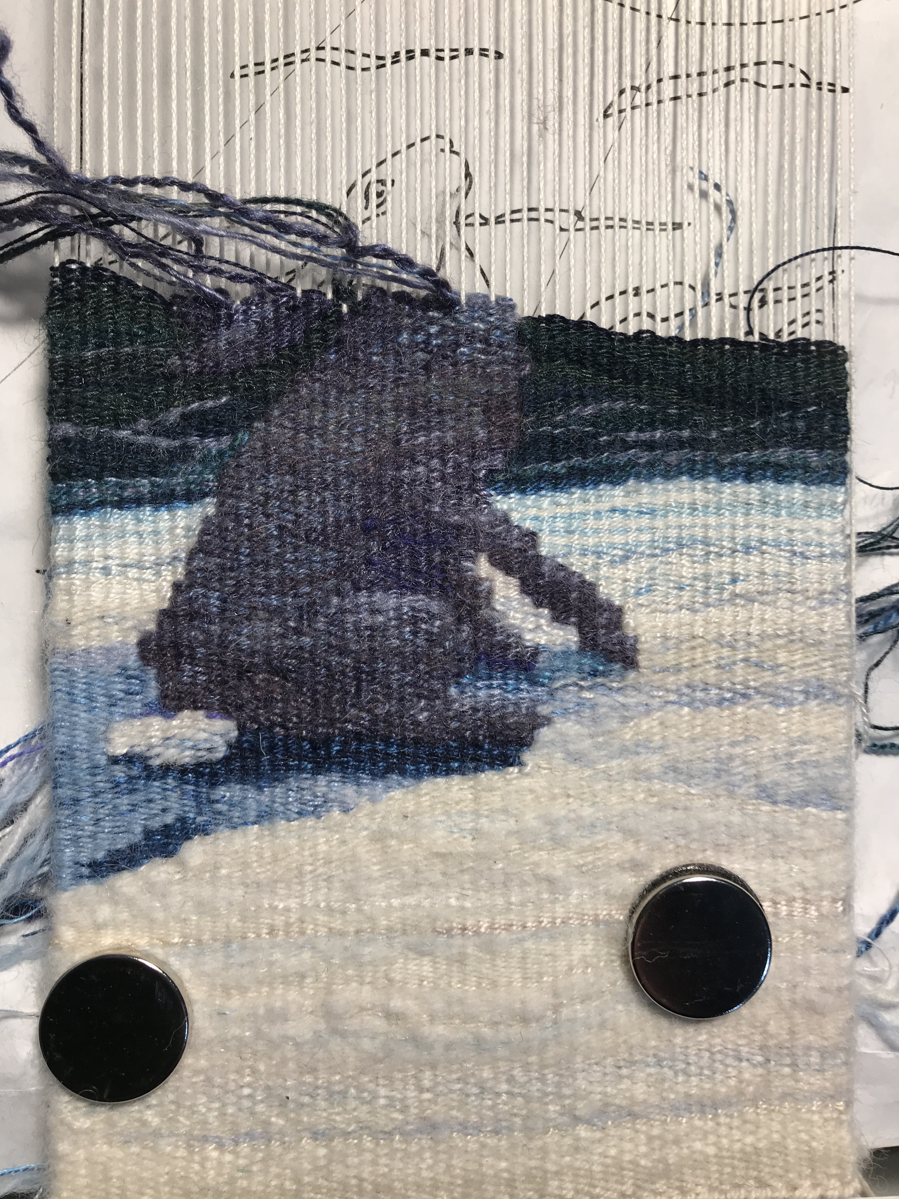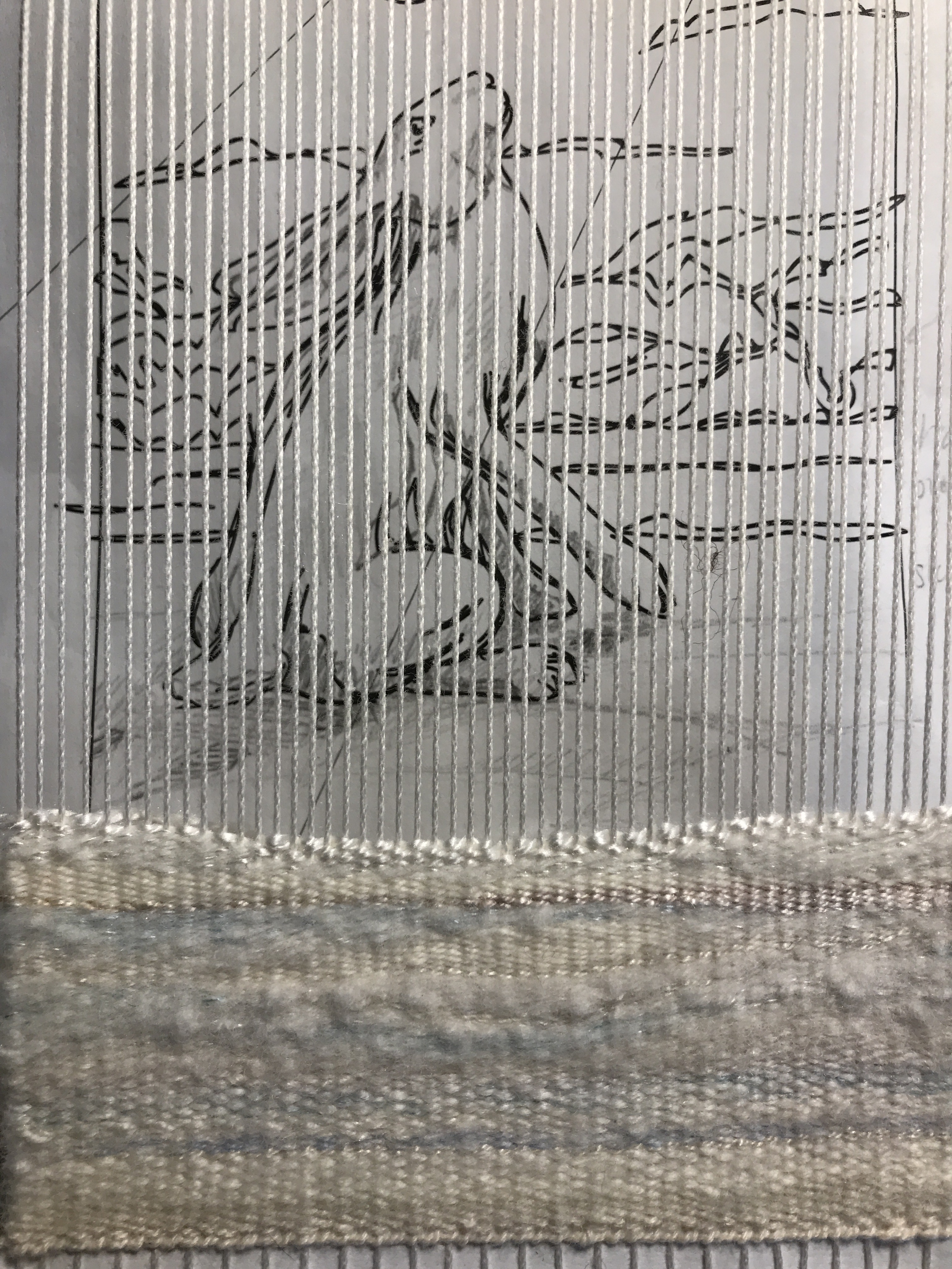 I look at these photos and remember the sheer frustration, every day. The cartoon was IN THE WAY when I manipulated the warp and every time the paper moves even a couple of millimetres I have to notice and move it back or the weaving will be the wrong shape. I tried drawing on the warps: the felt pen bled and blurred. I tried paired magnets to hold the cartoon (instead of tape, then stitching): if they were tight enough not to slip freely I couldn’t get them apart.