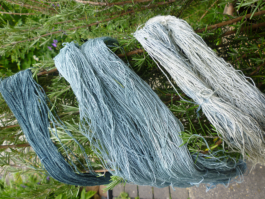 Handspun Bombyx silk indigo-dyed in three different vats. The dark blue on the left was put dry (unwetted) into a 1-2-3 Fructose vat, to which I added a little more fructose and heat to raise the temperature back to 50°C before leaving the silk for 45 mins. The patchy warm-grey-blue on the right was well-wetted before spending an hour in the urine vat. The curl of bright blue silk in the centre had 5 dips in a standard Thiox vat.