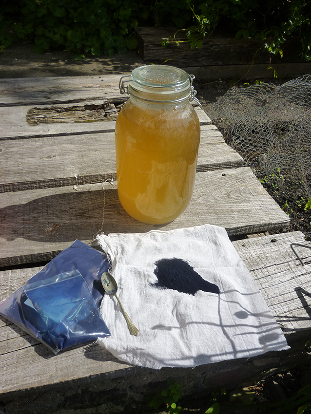 pH – the acidity or alkalinity of the vat – is important, as the conversion to leuco-indigo requires an alkaline environment. It’s easiest to predict and maintain in a chemical vat, with recipes calling for measured amounts of lye (sodium hydroxide) or washing soda/soda as/soda crystals (sodium carbonate) or calc aka calcium hydroxide aka slaked lime. It’s just as important in a biological vat, but much trickier to maintain, because the fermentation process produces byproducts such as lactic acid that lower the pH. Apparently dyers in the past learned to manage their vats by tasting the fluid or feeling it between their fingers, trying for something that’s slippery (alkaline), but not too slippery. Fortunately we have pH paper, which works even for indigo vats – the blue does not appear so quickly that it prevents reading the pH.
