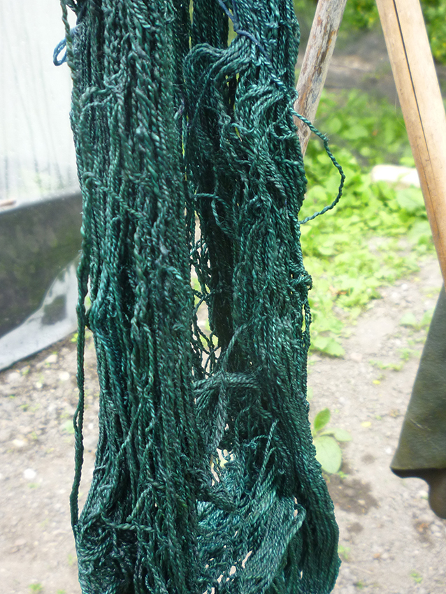 But protein fibres such as silk and wool are damaged by high pH, and heat accelerates the damage. pH paper allowed me to confirm that my sig (urine) fermentation vat does indeed run at about pH 9 in the relative coolth of the pop-up greenhouse, whereas the 1-2-3 Fructose vat I created yesterday was pH11 at 50°C. So: to dye my handspun silk (a smooth, dense fibre, hence takes up less dye) a dark blue, I had the option of multiple dips in the urine vat OR a shorter single dip in the Fructose vat.